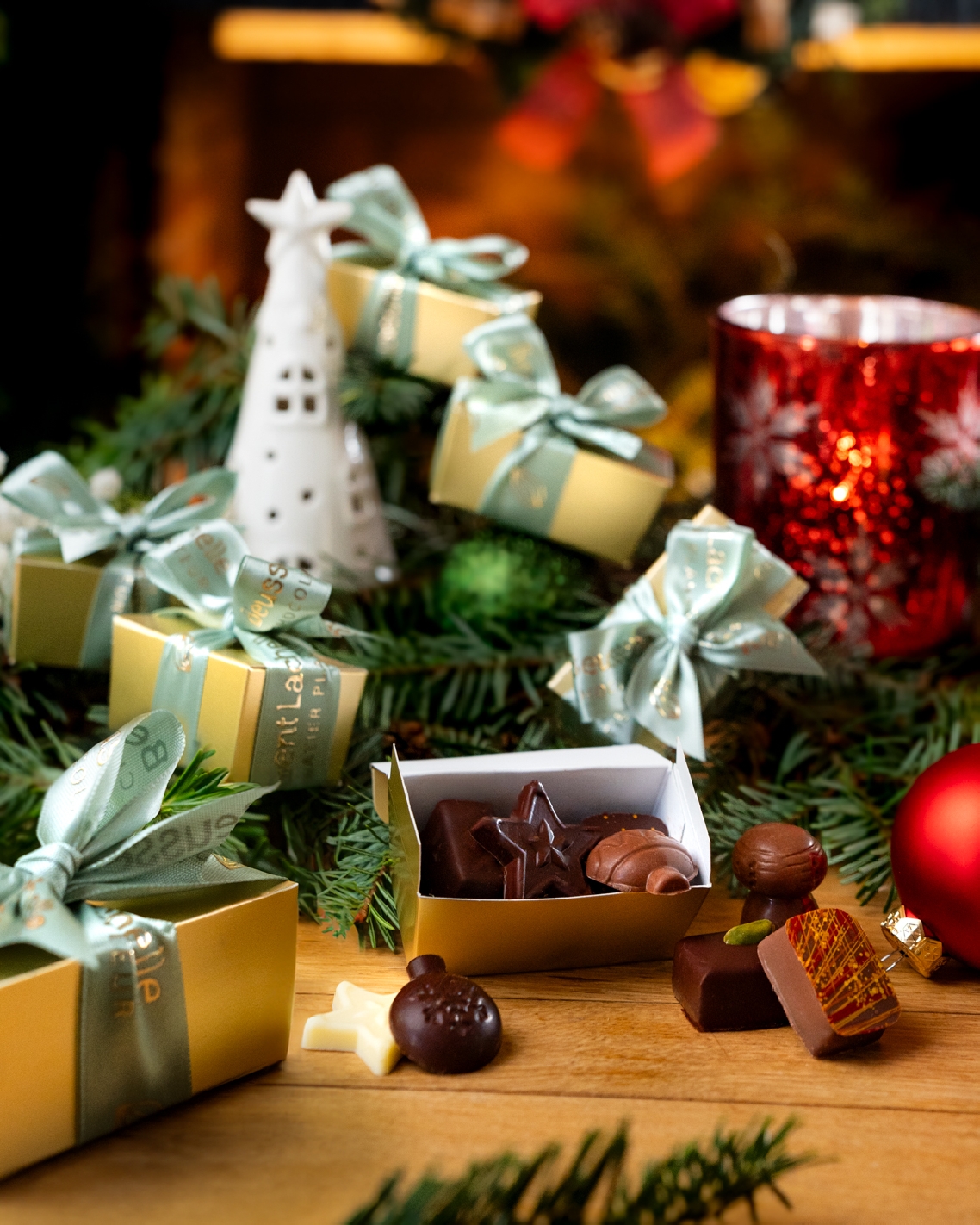 Le Cadeau convive mini ballotin est la touche finale parfaite pour sublimer votre table de Noël. Composé de trois chocolats fins, d’une orangette enrobée et d’une friture festive, ce petit coffret est une élégante attention pour vos invités.