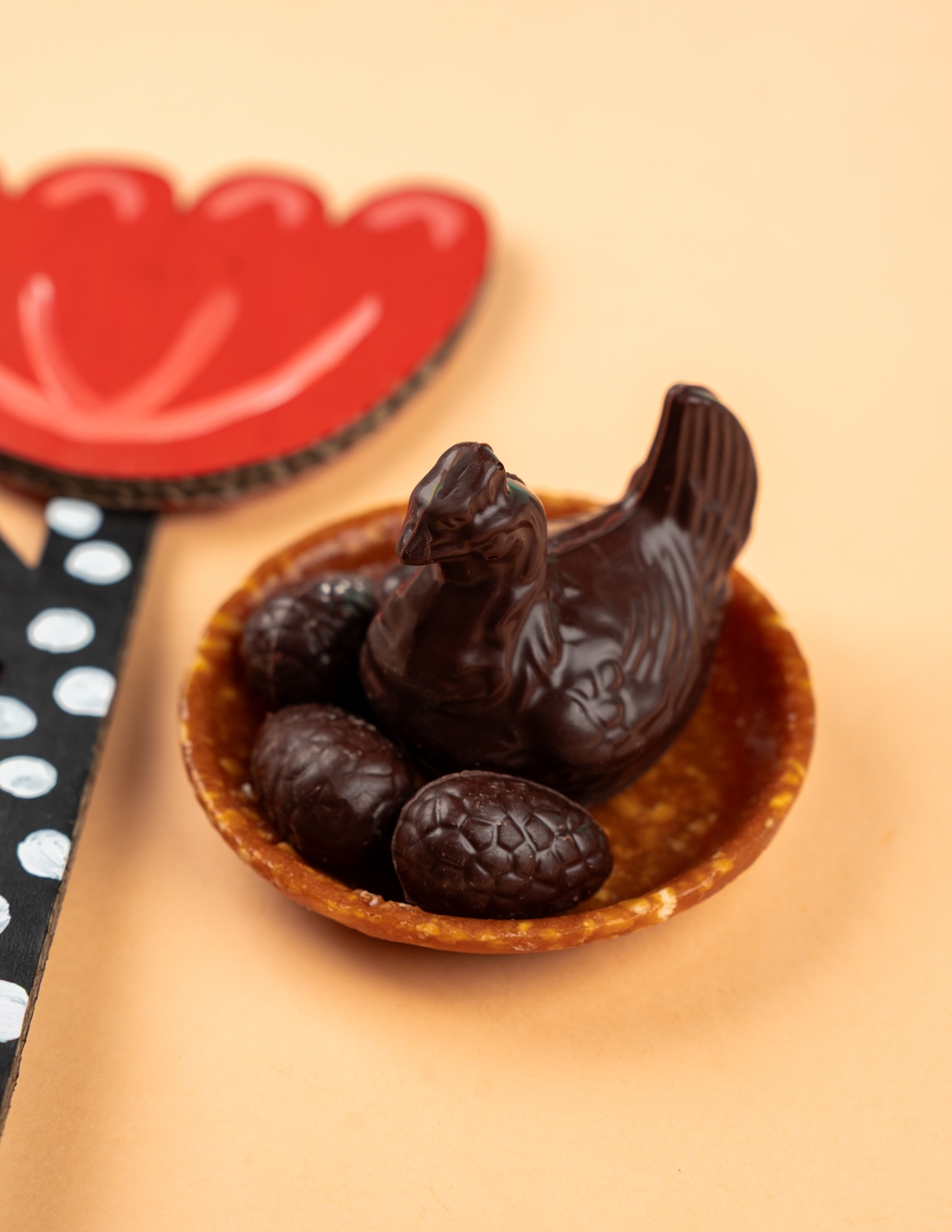 Nestled on its gourmet watering can, this hen in intense dark chocolate or creamy milk chocolate hides a true treasure of sweetness. The eggs filled with Beussent Lachelle praline reveal a heart of Piedmont hazelnuts, offering an exquisite tasting experience. A playful and refined set, perfect for surprising and delighting both young and old at Easter!
